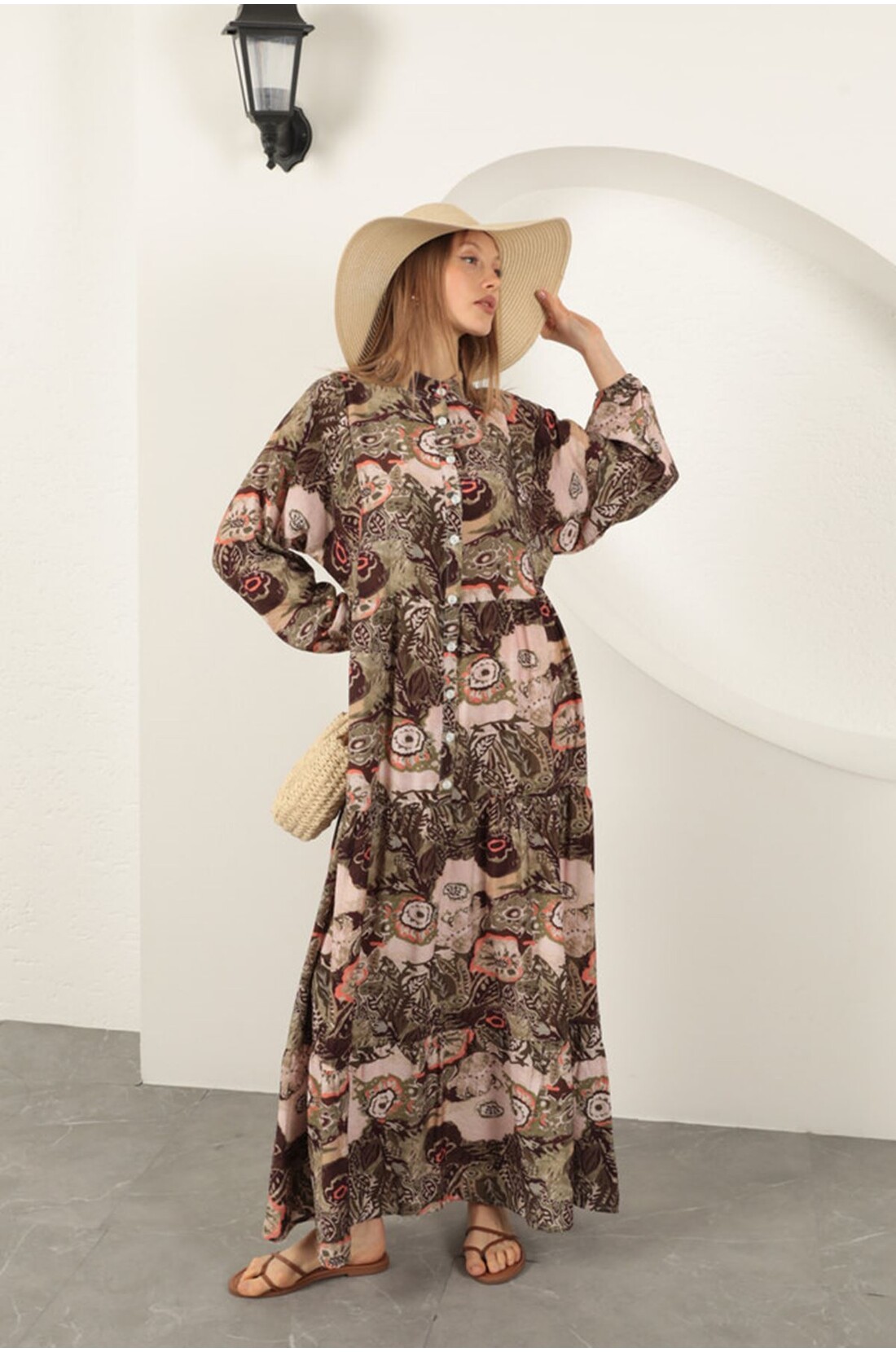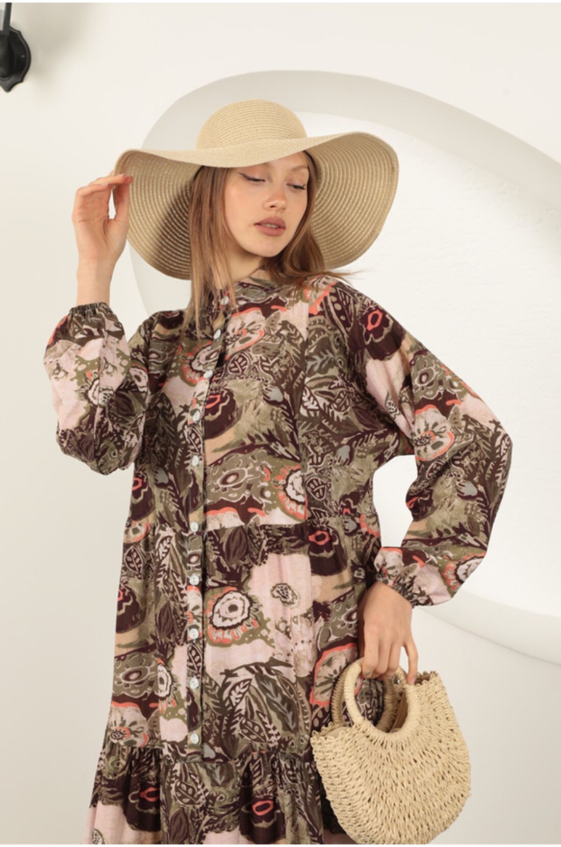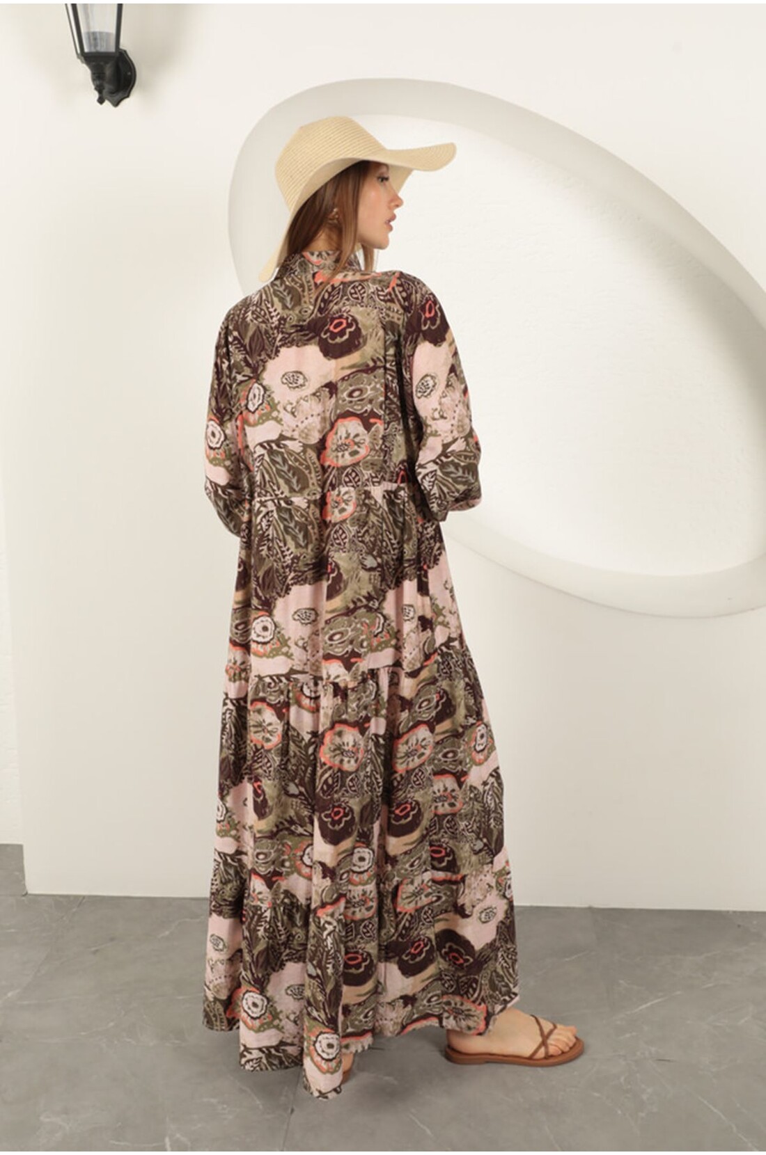Viskon Kumaş Etnik Desenli Elbise-Haki