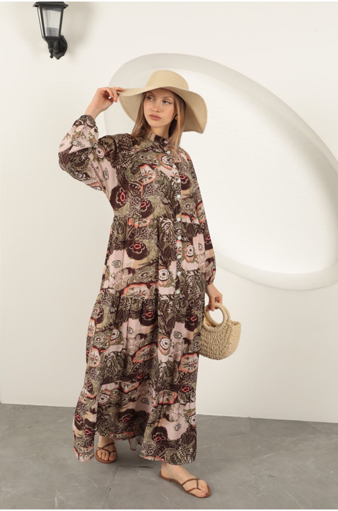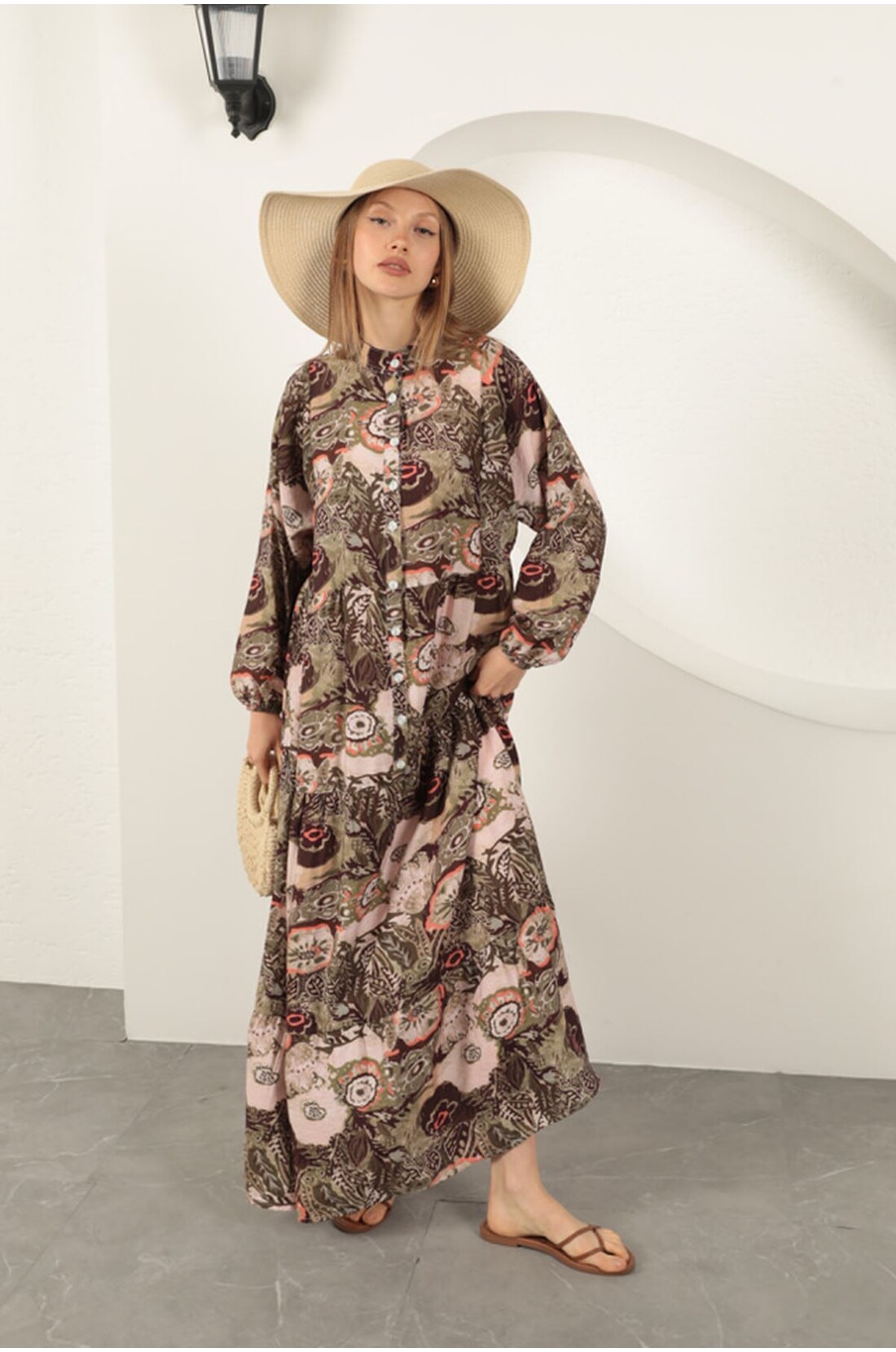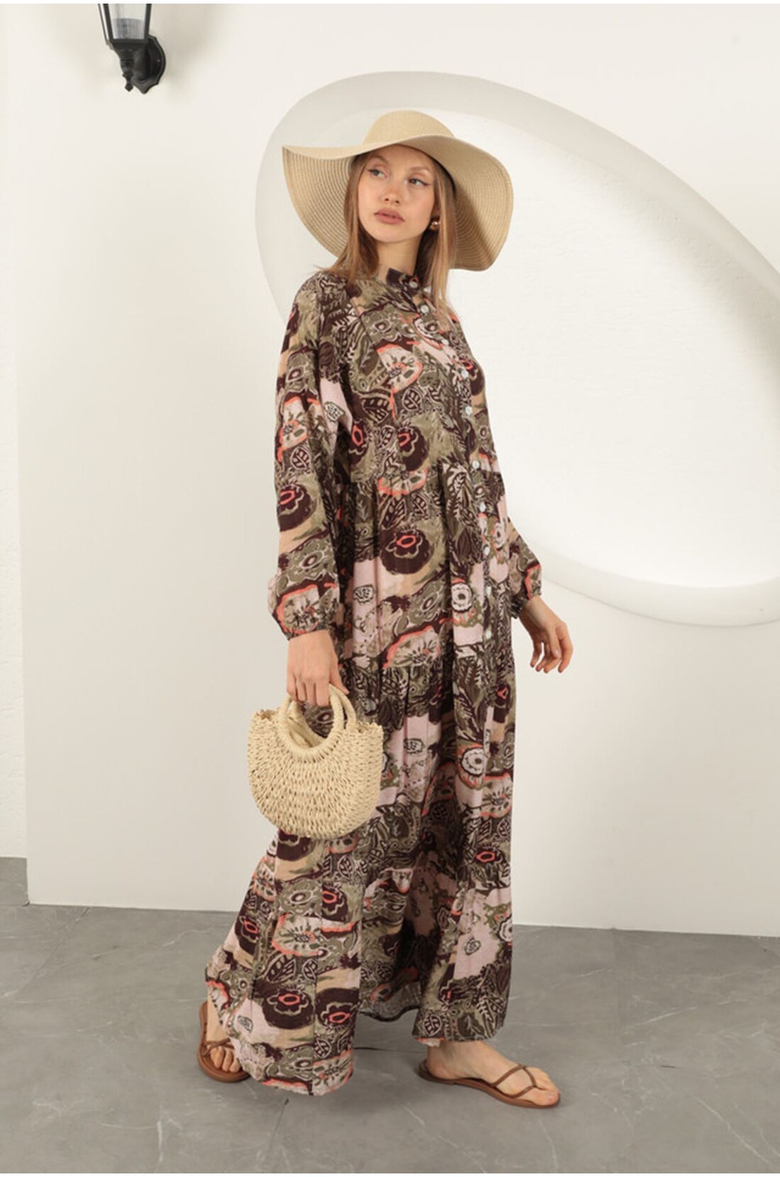 Viskon Kumaş Etnik Desenli Elbise-Haki