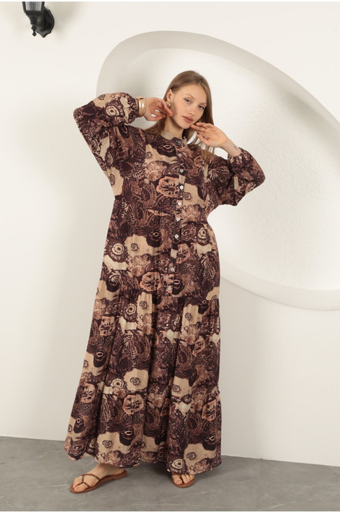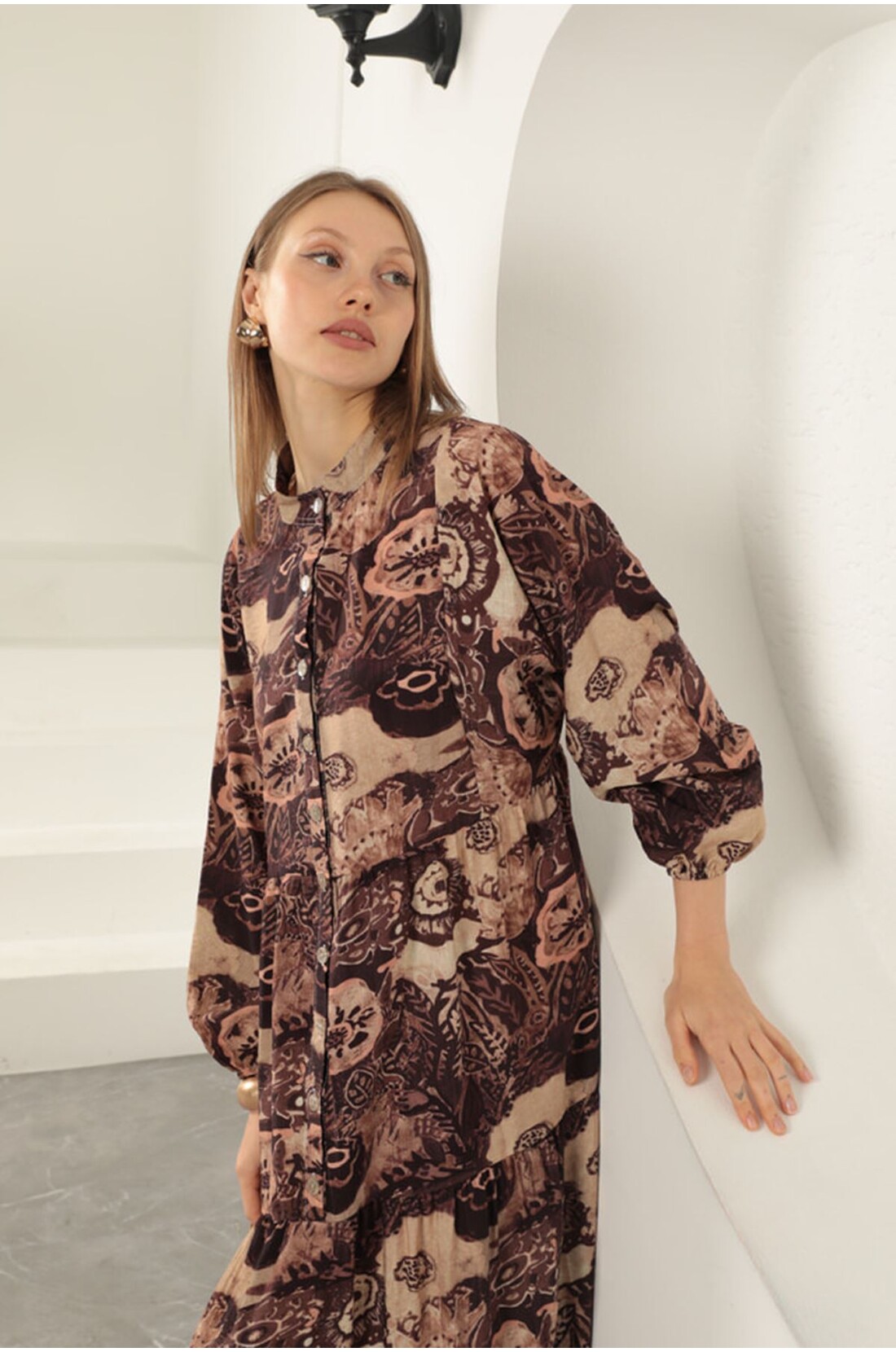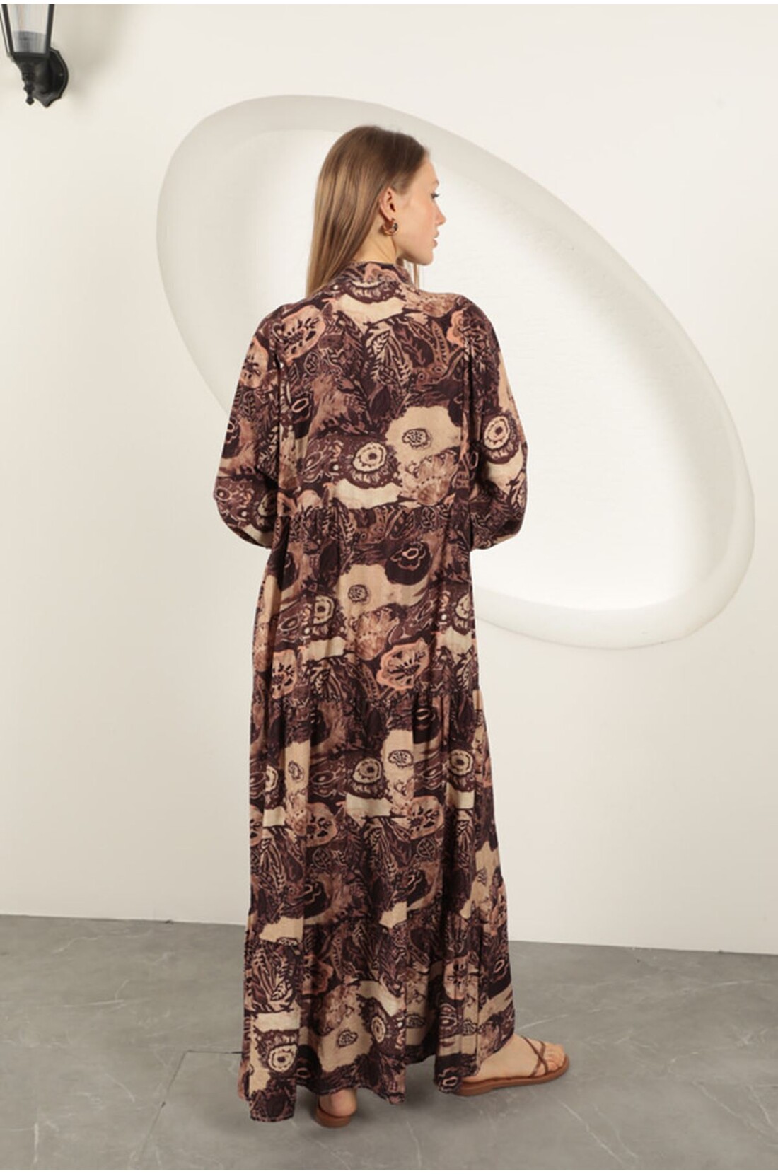 Viskon Kumaş Etnik Desenli Elbise-Kahve