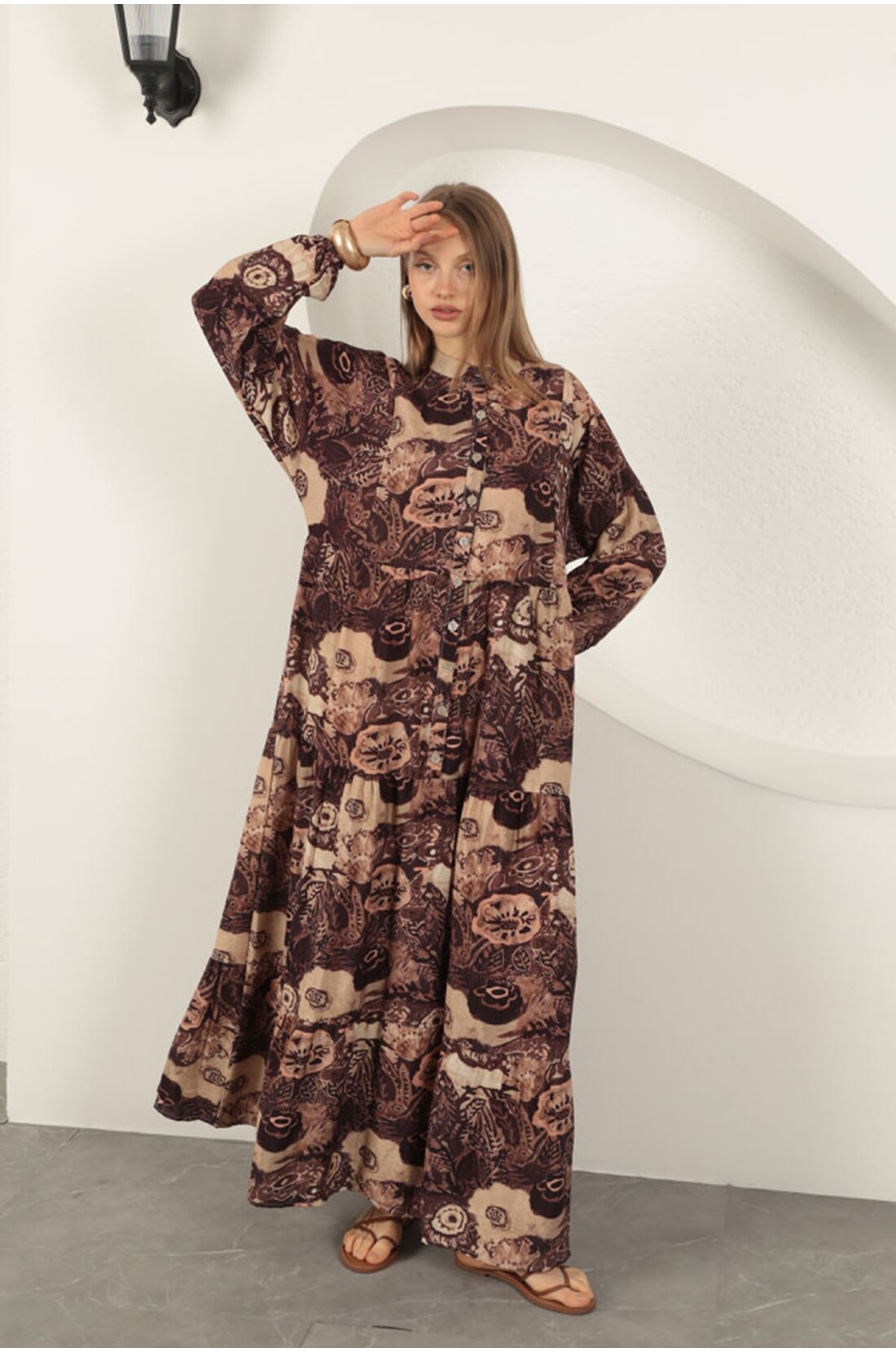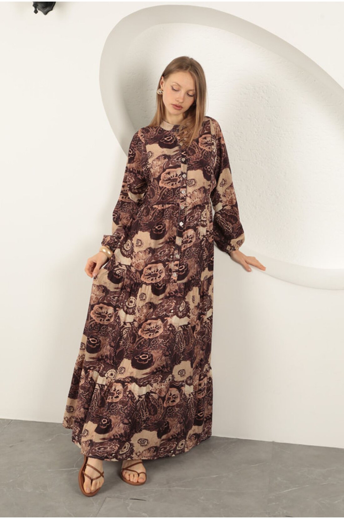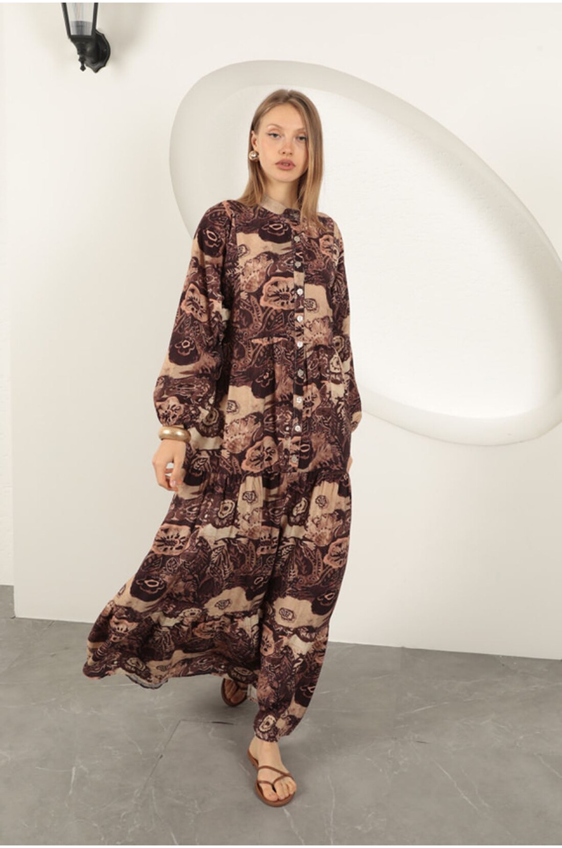 Viskon Kumaş Etnik Desenli Elbise-Kahve