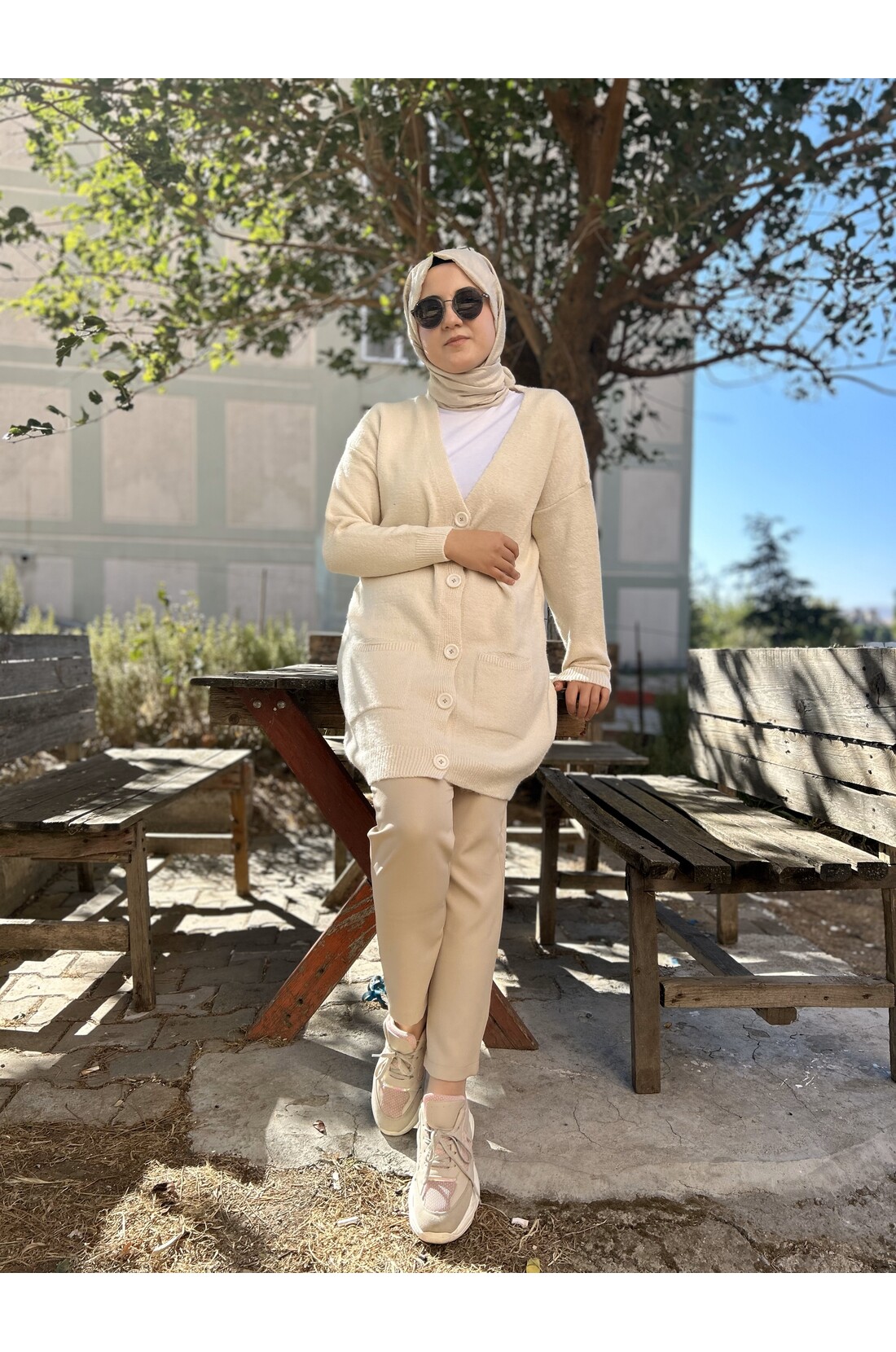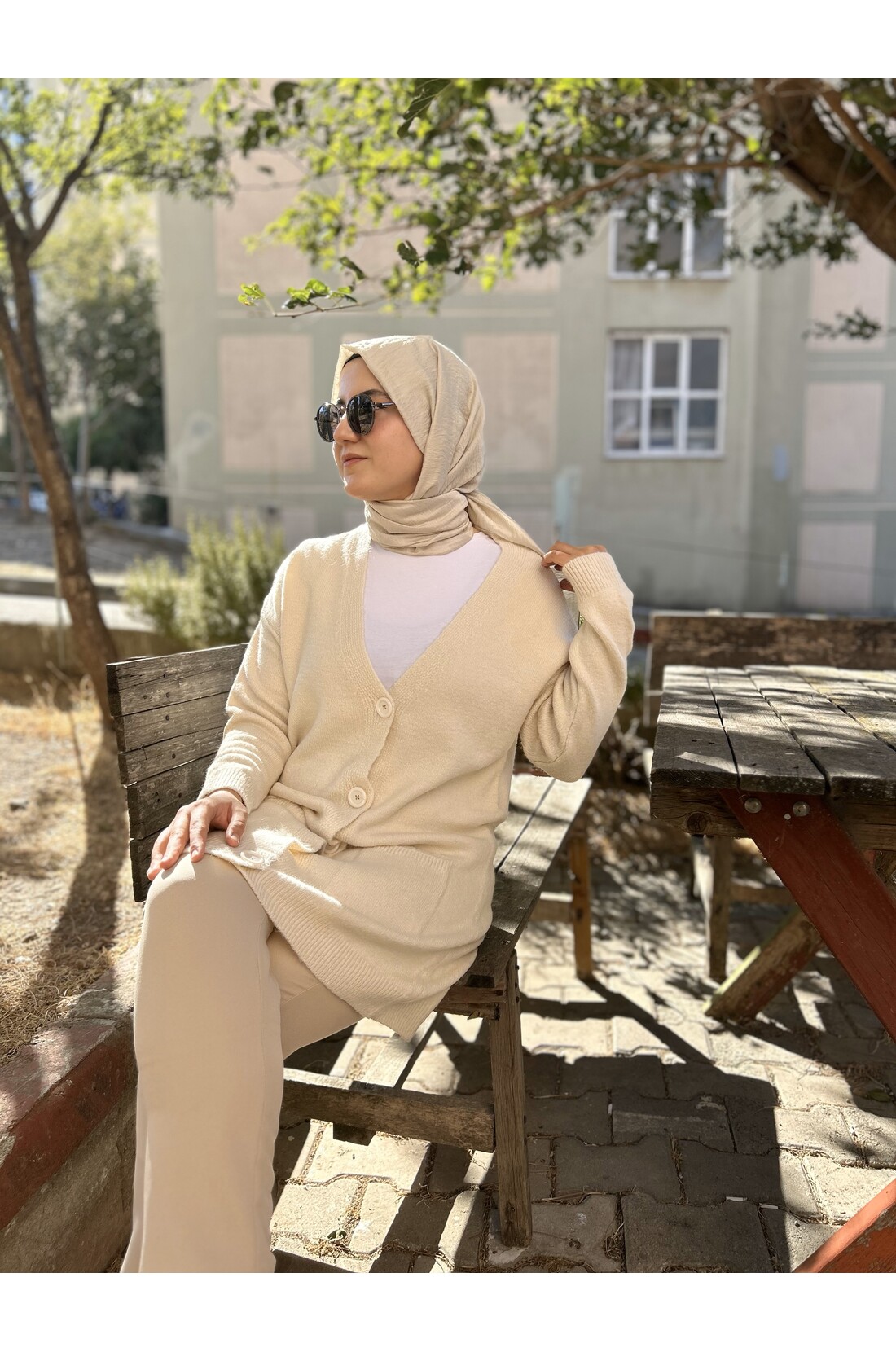 Düğme Detaylı Cepli Uzun Hırka Krem