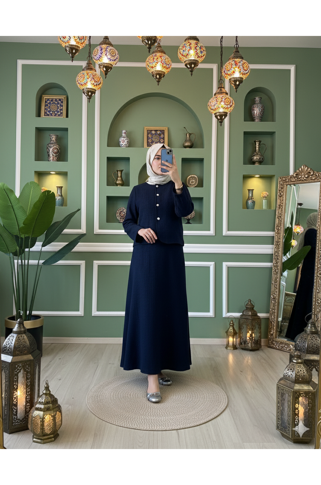 Klasik ve modern tarzın zarif birleşimi olan lacivert tüvit ikili takım, şıklığı ve rahatlığı bir arada sunar. Üst kısmı düğme detaylı kısa ceket formunda olup, alt kısmı uzun ve geniş kesim etekten oluşmaktadır. Hem günlük hem de iş hayatında rahatlıkla kullanabileceğiniz bu takım, kaliteli tüvit kumaşı ile şıklığınızı tamamlayacak. Minimal tasarımı ile sade ve zarif bir görünüm elde edebilirsiniz. Özellikle sonbahar ve kış aylarında tercih edebileceğiniz bu takım, dolabınızın vazgeçilmez parçalarından biri olacak.