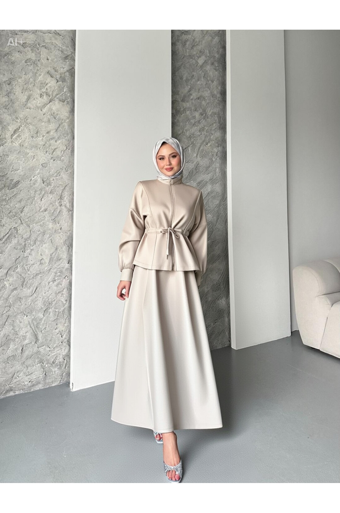 Ceket ön fermuarlı bel büzgülü, etek beli lastikli Scuba takım tesettür.