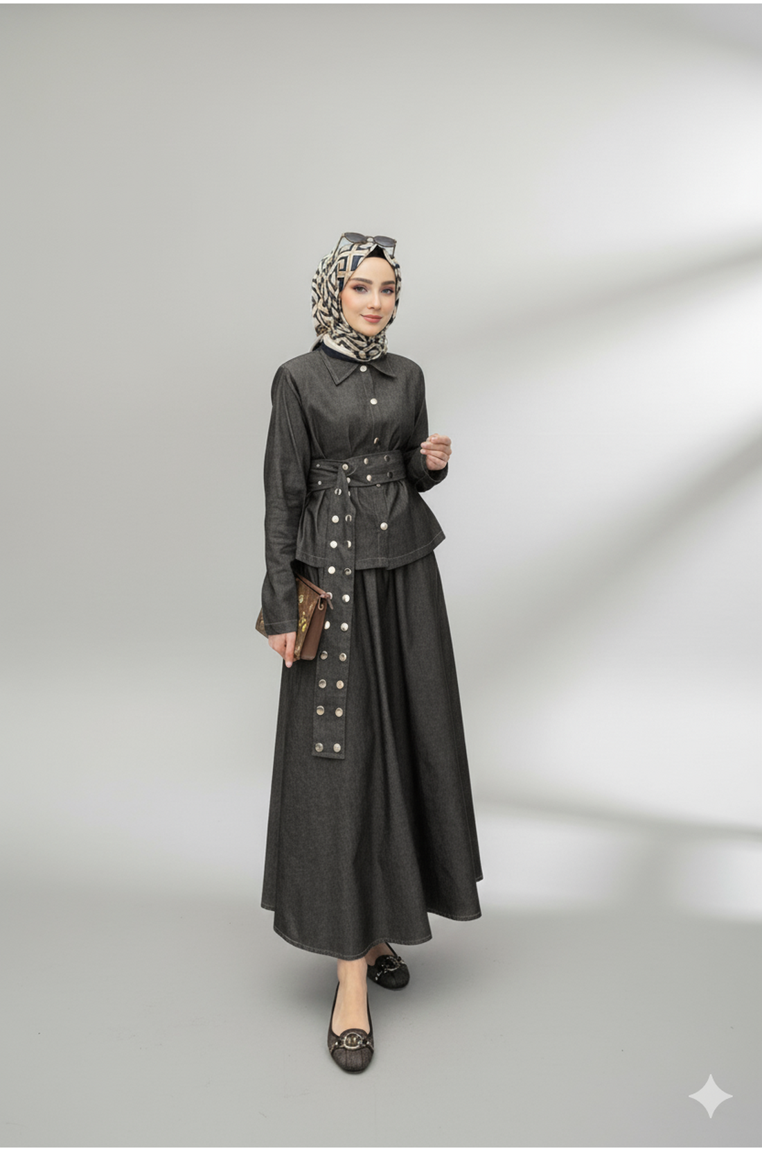 Etek :Beli lastikli , kloş kesime sahip kot etek .Üst : Klasik yaka , önden çıt çıt düğmeli , omuzdan vatkalı , çıt çıt düğmeli gömlek .